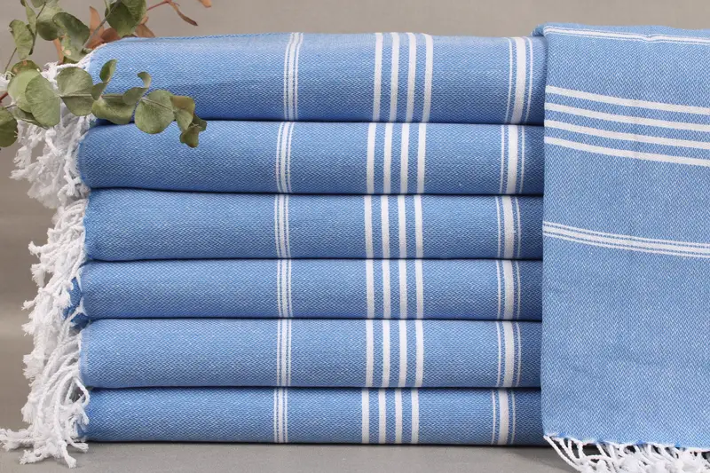 Turkish bath towels are woven from organic Turkish cotton, ensuring a high-quality material known for its absorbency and durability. Characterized by dimensions of 40x71 inches or 100x180 centimeters, these towels weigh approximately 290 grams, with a hand-weaving tolerance of ± 2 inches or 5 centimeters.