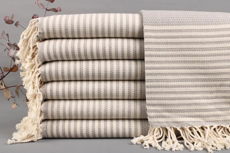 Organic Turkish cotton ensures high absorbency and durability in each towel. Characterized by precise hand-weaving, dimensions are 40x70 inches or 100x180 centimeters, with a weight range of 425-475 grams. Size tolerance is ± 2 inches or 5 centimeters due to manual crafting.