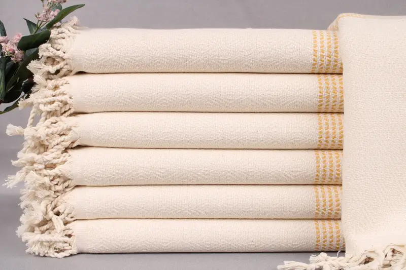 The beach towels are made from organic Turkish cotton, ensuring durability and high absorbency. Resulting in a towel that dries quickly and becomes softer with each wash. The towels measure 40x71 inches (100x180 cm) and weigh 450 grams, with hand-weaving tolerances of ±2" (±5 cm).
