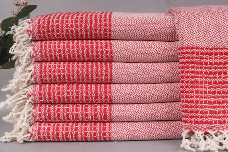 The product is woven from organic Turkish cotton, ensuring a natural and sustainable material choice. Characterized by a weight of 420 grams, the towels measure 36x69 inches or 90x175 centimeters, with a tolerance of ± 2" or 5cm due to the hand-weaving process. Embroidery customization is available, allowing for personalization with letters, names, or logos, which should be specified in the order details including font choice and color.