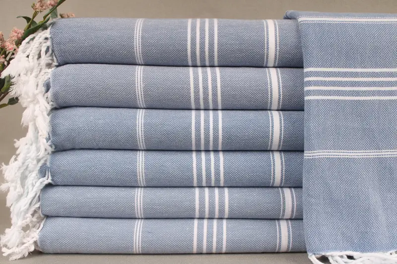 Handcrafted organic Turkish cotton towels, ensuring high absorbency and durability. Characterized by dimensions of 71x40 inches (180x100 cm) and weighing 265 grams, these towels are hand-woven with a tolerance of ± 2 inches (5 cm). Embroidery customization is available, allowing personalization with letters, names, or logos in specified fonts and colors.