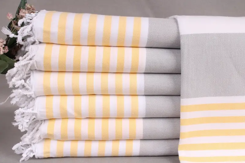 Our product line consists of beach towels and throws woven from organic Turkish cotton, ensuring superior absorbency and durability. Characterized by dimensions of 40x71 inches or 100x180 centimeters, each piece weighs 280 grams with a weaving tolerance of ± 2 inches or 5 centimeters. Production involves a traditional hand-weaving process on looms.