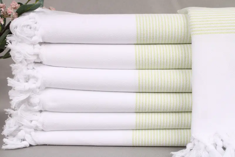 Organic Turkish cotton characterizes the beach towels, ensuring superior absorbency and durability. Resulting in a soft, yet robust towel, each piece is woven on looms and handmade. Dimensions are specified as 40x71 inches (100x180 centimeters) with a tolerance of ± 2 inches or 5 centimeters, weighing 290 grams.