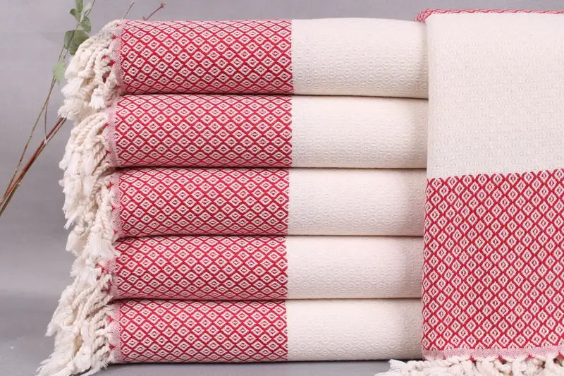 Weaving techniques ensure the towels are characterized by high absorbency and durability. The towels, composed of organic Turkish cotton, are meticulously hand-woven on looms, providing a unique texture and strength. Each piece weighs approximately 380 grams, measuring 36x71 inches or 90x180 centimeters with a tolerance of ±2 inches or 5 centimeters.