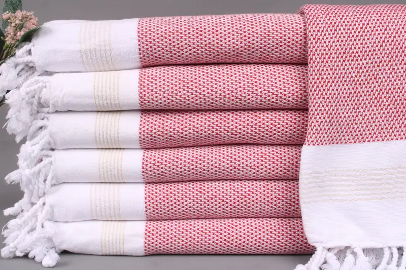 The beach towels are woven from organic Turkish cotton, ensuring superior absorbency and comfort. Characterized by meticulous hand-weaving on looms, each towel measures 40x71 inches (100x180 cm) with a weight of 390 grams. Size tolerances are ±2 inches (5 cm) due to the artisanal process.