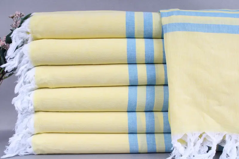 Organic Turkish cotton ensures superior absorbency and durability. Resulting in a towel that becomes softer with each wash, these beach towels require a gentle wash at 30-40 degrees Celsius. Measuring 36x71 inches or 90x180 centimeters with a ± 2-inch (5cm) tolerance, these handmade towels weigh 200 grams.