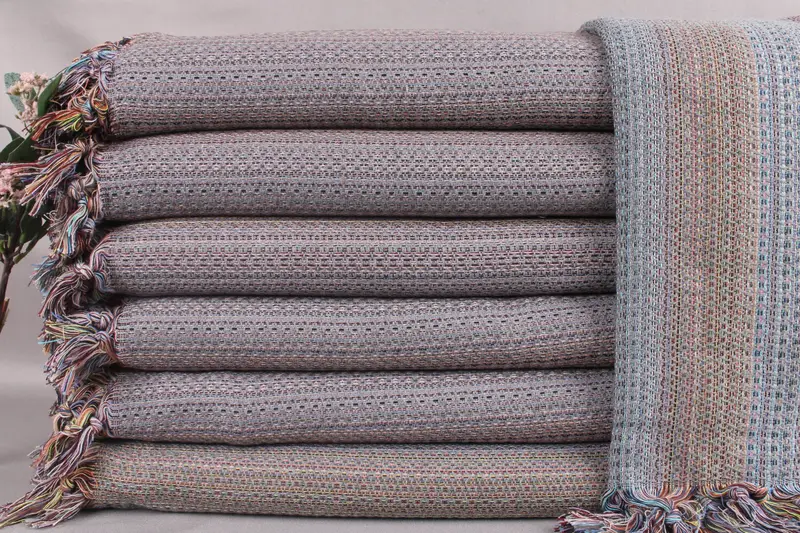 The Turkish towels and throws are constructed using organic Turkish cotton, ensuring high absorbency and durability. Each piece is meticulously hand-woven on traditional looms, resulting in a unique handmade texture. The throws are characterized by their dimensions of 87x89 inches or 220x225 centimeters, with a tolerance of ±2 inches or 5cm due to the weaving process. Additionally, each throw has a weight of 1180 grams.