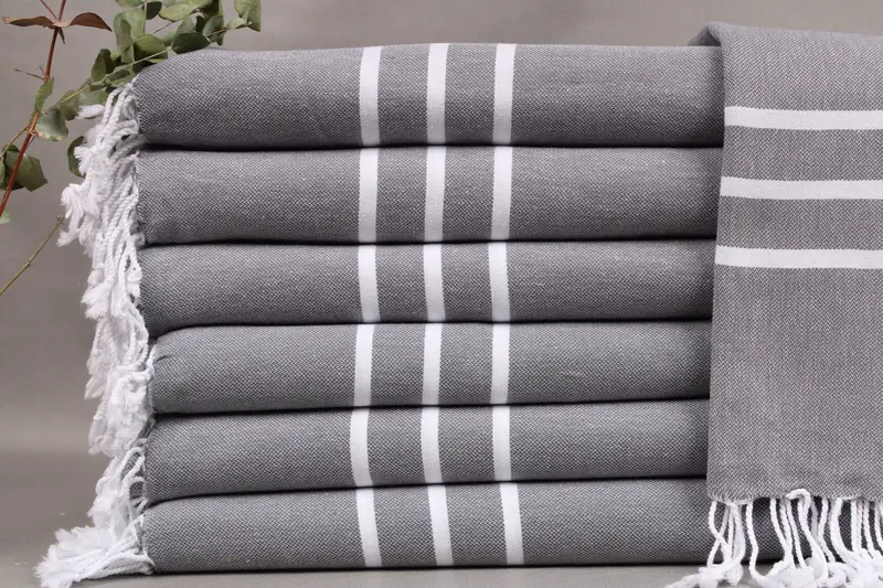 The beach towels are woven from organic Turkish cotton, resulting in an inherently soft and absorbent fabric. These items are each characterized by dimensions of 40x74 inches or 100x186 centimeters with a tolerance of ±2 inches (5cm) due to the hand-weaving process. Their weight is 430 grams, ensuring a durable yet lightweight construction.