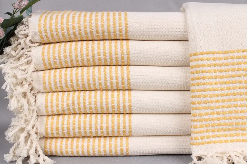 The beach towels are woven from organic Turkish cotton on looms, ensuring superior quality and hand-crafted finish. Characterized by its high absorbency, these towels are ideal for various uses, including beach, spa, and bath. Each towel measures 36x69 inches or 90x175 centimeters, with a tolerance of ±2 inches or 5 centimeters due to the weaving process. Weighing approximately 460 grams, the towels are designed to be durable yet soft.