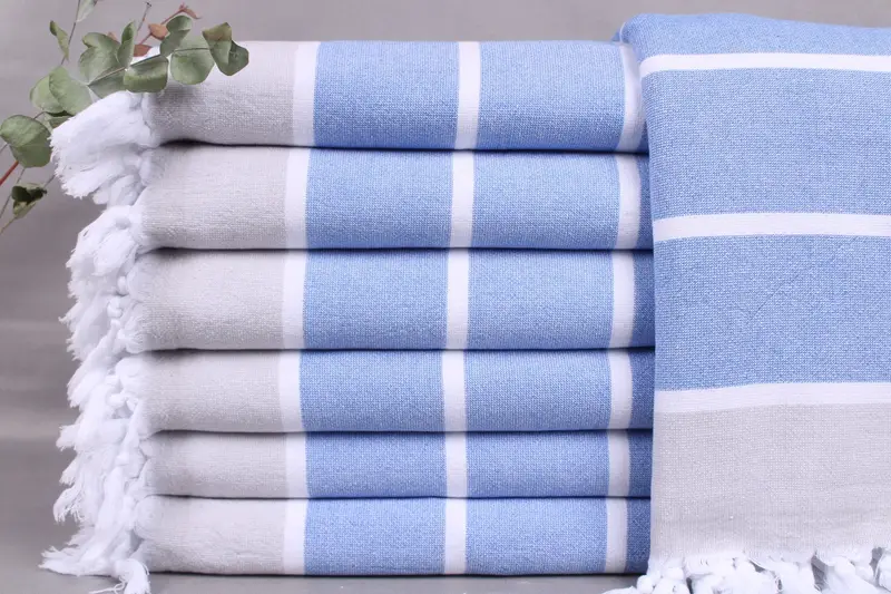 The Turkish towels are woven from organic Turkish cotton on looms, ensuring each piece is handmade and characterized by superior absorbency. These towels measure 36x67 inches or 90x170 centimeters, with a weight of 400 grams. Due to hand-weaving, sizes may vary by ± 2 inches or 5 centimeters.