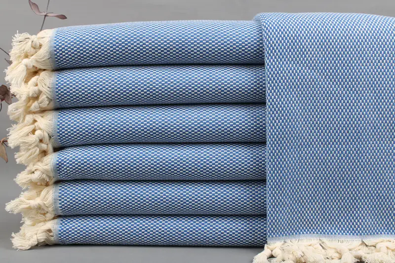 Characterized by their superior absorbency and texture, the Turkish towels are woven from organic Turkish cotton, ensuring a premium feel and durability. These towels, measuring 40x71 inches or 100x180 centimeters, have a weight of 400 grams and allow for a weaving tolerance of ± 2 inches or 5 centimeters. Resulting in artisanal quality, the towels are hand-woven on looms, contributing to their unique characteristics.