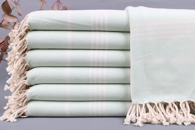 Organic Turkish cotton is employed to create bath towels, blankets, and throws, ensuring high-quality fiber composition and absorbency. Characterized by a dimension range of 40x67 inches or 100x180 centimeters, the products have a weight between 425-475 grams, with tolerances of ± 2 inches or 5 centimeters due to hand weaving.