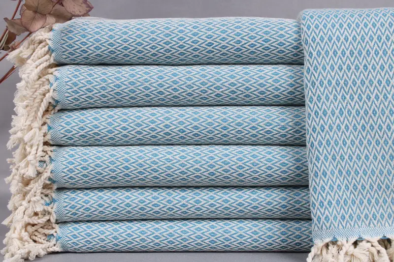 Turkish Bath Towels are woven from organic Turkish cotton, ensuring quality and sustainability. Characterized by dimensions of 40x71 inches or 100x180 centimeters and a weight of 400 grams, the towels maintain tolerances of ±2 inches or ±5 cm due to hand weaving. Personalization options include embroidery or monogramming with specific instructions for placement, font, and color.