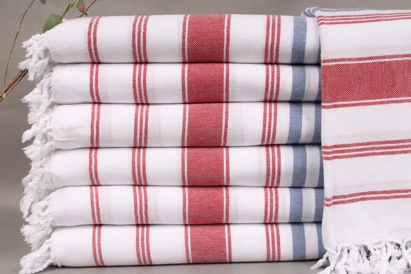 All beach towels are woven from organic Turkish cotton, characterized by high absorbency and durability. Each piece measures 40x71 inches (100x180 centimeters) and weighs 300 grams. Due to hand-weaving, size tolerance is ±2 inches (5 centimeters).