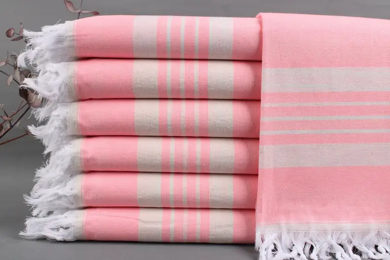 Organic Turkish cotton fibers ensure high absorbency and softness, resulting in towels that soften with each wash. Measuring 40x71 inches or 100x180 centimeters, each item weighs 270 grams with a hand-weaving tolerance of ±2 inches or 5 centimeters. Customization options include embroidery or personalization with letters, names, or logos, which should be noted with specifics on font, color, and placement.