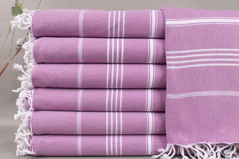 Turkish towels are characterized by their fiber composition, specifically organic Turkish cotton. Ensuring high absorbency and durability, these towels are woven by hand on looms. Resulting in a weight of 265 grams and dimensions of 40x71 inches or 100x180 centimeters, with a tolerance of ±2 inches or 5cm due to weaving. These towels can be personalized with embroidery, including letters, names, or logos, with customization options for font, color, and placement.
