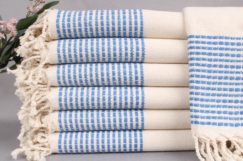 Fiber composition ensures superior absorbency, characteristic of Turkish cotton. Each product is hand-woven from organic Turkish cotton, resulting in a 36x69 inches (90x175 centimeters) dimension. Weighing approximately 460 grams, these items have a weaving tolerance of ±2 inches or 5 centimeters.