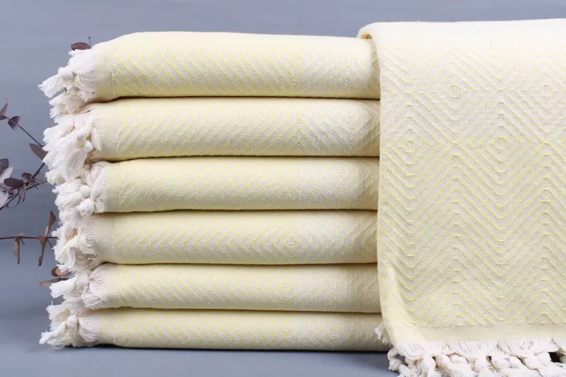 Each product is composed of organic Turkish cotton, ensuring high absorbency and durability. Characterized by a fiber composition that enhances softness with each wash, these towels and throws are hand-woven on traditional looms. Resulting in a tolerance of ±2 inches or 5 centimeters in their dimensions of 79x91 inches or 200x230 centimeters, these items weigh 1040 grams.