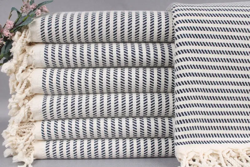 Organic Turkish cotton characterizes the towel's exceptional absorbency and softness. Dimensions span 40x71 inches or 100x180 centimeters with a tolerance of ±2" or 5cm, ensuring consistent sizing. Towels weigh 340 grams, with weight variations inherent to their hand-woven construction.