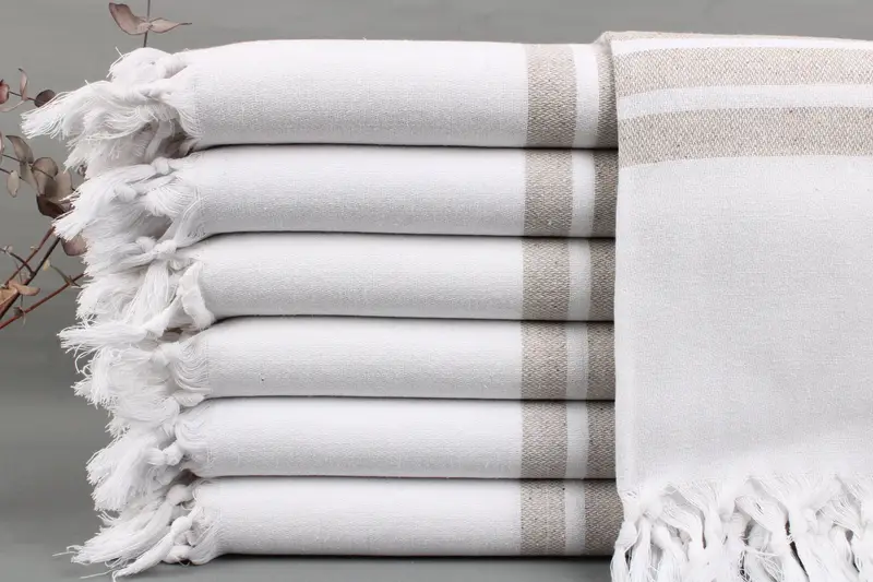 All towels are woven from organic Turkish cotton, ensuring durability and softness. These Turkish towels, weighing 262 grams, measure 40x71 inches (100x180 centimeters) with a tolerance of ±2 inches or 5 centimeters due to hand-weaving. Each piece can be personalized with embroidery or printing of names and logos, adhering to precise placement recommendations.