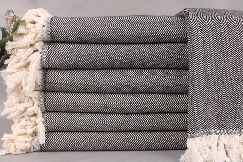 Characterized by organic Turkish cotton, the blanket ensures optimal absorbency and durability. The herringbone Turkish cotton blanket measures 79x99 inches or 200x250 centimeters with a weight of 1500 grams, allowing for ±2 inches or 5 centimeters tolerance due to hand-weaving. Ensuring personalization, the blanket can be embroidered with letters, names, or logos, shipped worldwide with free shipping on orders over 35 USD, and offers returns/exchanges per defined policy.