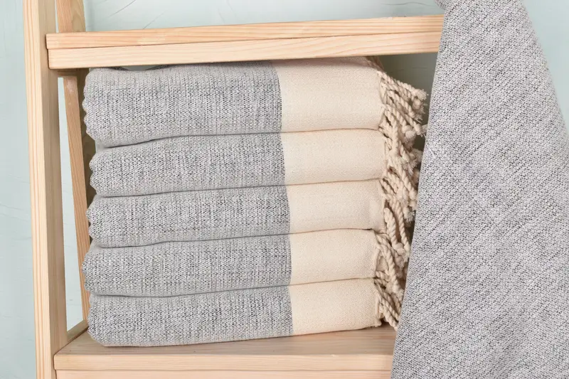 Organic cotton and linen fiber composition ensures superior absorbency and durability, characterized by a soft texture and breathability. The flat towel measures 40x63 inches and weighs 400 grams, with hand-weaving tolerances of approximately 1-2.5 centimeters. Each order is meticulously handcrafted, resulting in potential slight variations in size and weight.