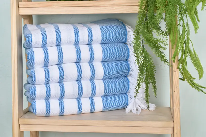The 36x67 inches Sax Blue Cotton Towel, made from organic cotton, exhibits high absorbency due to its fiber composition, ensuring excellent moisture wicking properties. Weighing 380 grams, the towel provides substantial comfort, yet its handmade nature results in slight variations of up to 1-2.5cm in size. Pre-shrunk and meticulously woven on a loom, it ensures consistent quality.