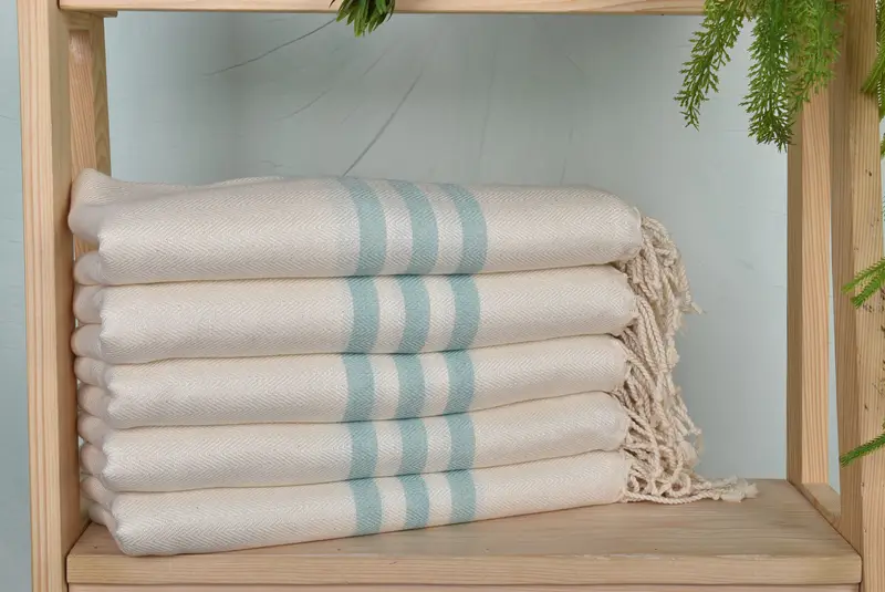 Composed of organic cotton and linen, the striped towel is characterized by its high absorbency and natural durability. Ensuring softness and breathability, this material blend results in a comfortable textile suitable for extensive use. Measuring 70 x 40 inches (177.8 x 101.6 cm) and weighing 250 grams, the towel is subject to slight variances due to hand-weaving. These variations may include dimensional differences up to 2.5 cm and weight deviations within a typical range.