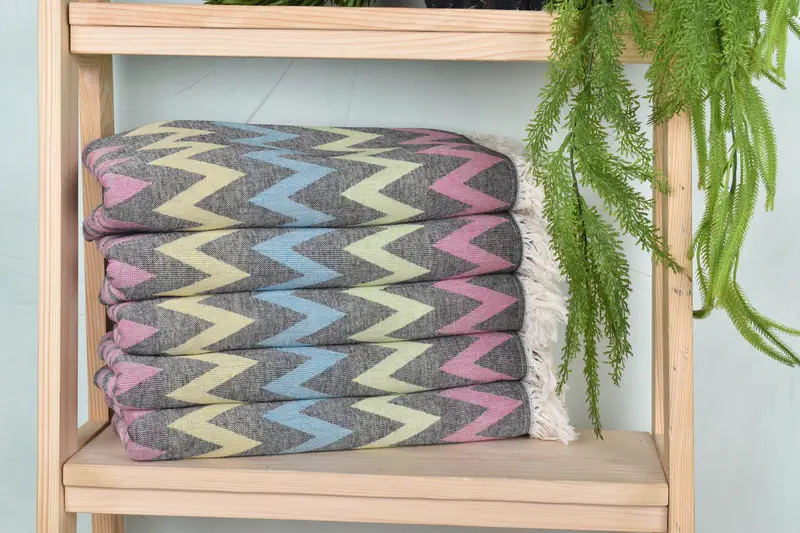 Organic cotton and linen towels ensure superior durability and absorbency, characterized by their high quality fiber composition. Each Zigzag Design Towel measures 40x71 inches and weighs 350 grams, with dimensions potentially varying by up to 2.5 cm due to the handmade nature of the product. Custom embroidery is available for personalization, enabling customers to add names, initials, or logos. Pre-washed towels are ready for use, with initial washing recommended at 30 degrees.