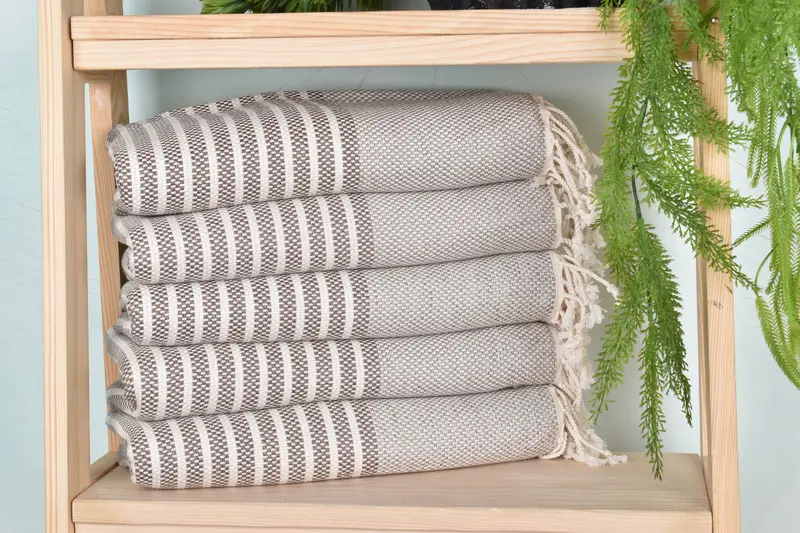 Characterized by its robust fiber composition, the striped towel is crafted from a blend of organic cotton and linen, ensuring superior absorbency and durability. Resulting in dimensions of 40x75 inches, the towel weighs 400 grams and allows a slight variation in size and weight due to its handmade nature, typically within a tolerance of 1-2.5cm. Customization extends to embroidery options, including names, initials, or logos, with thread colors selectable from a provided palette.