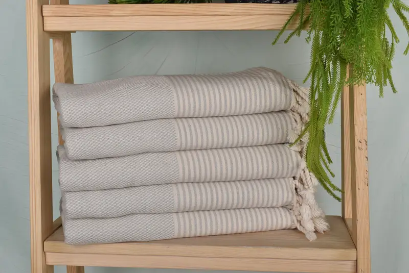 The Turkish Beach Towel is characterized by its sub-category classification as a beach towel. Ensuring high absorbency and softness, it is composed of organic cotton, lending it a light gray hue. The towel, weighing 380 grams, measures 70 by 36 inches, providing a comfortable size for various uses.