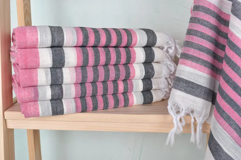 The towels are characterized by their fiber composition of organic cotton and linen, ensuring high absorbency and durability. Each towel measures 40x67 inches with a weight of 175 grams, and due to their handmade nature, dimensions may vary slightly by up to 1-2.5 cm. Customization includes embroidery options for names, initials, or logos with choices of font and thread color.
