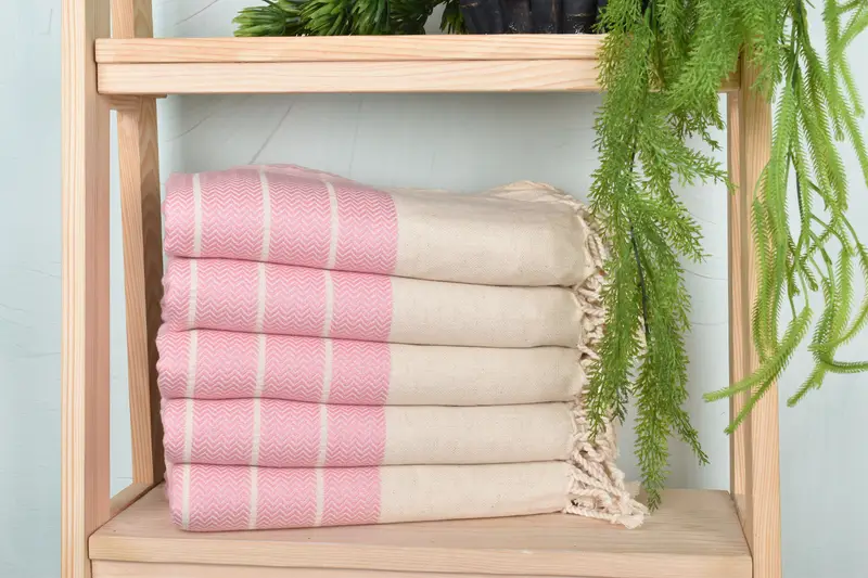 Characterized by its blend of organic cotton and linen, this towel provides excellent absorbency. Ensuring high durability, it measures 40x67 inches and weighs 330 grams. Hand-weaving tolerances may result in slight variations of up to 2.5 cm.