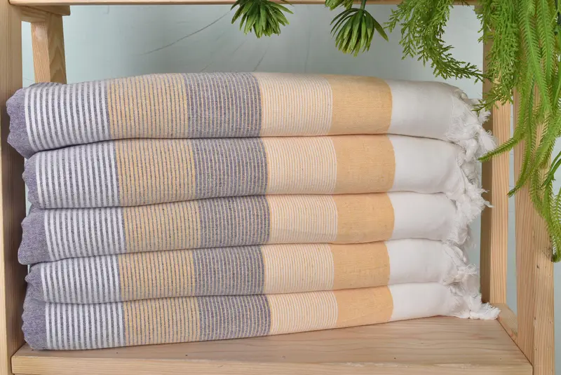 Organic cotton/linen composition characterizes the towels, ensuring durability and absorbency. The dimensions are 67x40 inches, translating to 170.18x101.6 cm, with a weight of 260 grams. Hand-weaving results in size tolerances of approximately 1-2.5 cm.