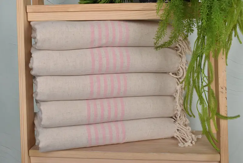 Characterized by their organic cotton and linen blend, these towels ensure superior absorbency and comfort. Measuring 36 inches by 67 inches, each towel weighs approximately 250 grams, with slight variations due to the hand-weaving process allowing for tolerances of up to 2.5 centimeters. Orders can be customized with embroidery, subject to pre-shrink washing instructions, and ship within one to two days, with a return policy of up to seven days.