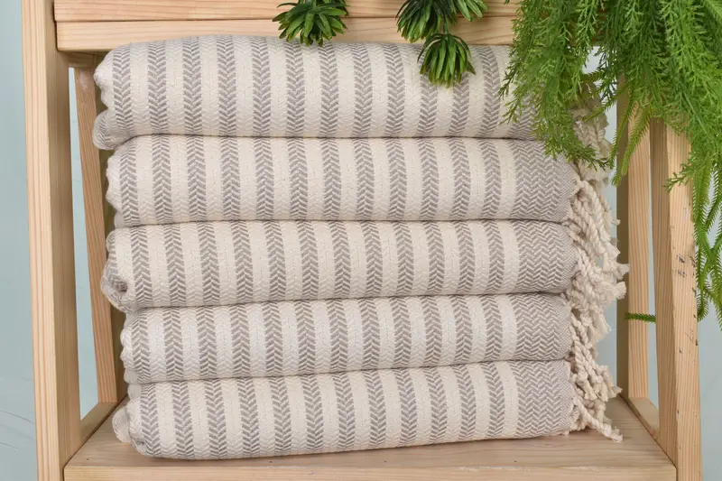 The hand towels are characterized by a blend of organic and recycled cotton, ensuring high absorbency and durability. Measuring 40x18 inches and weighing approximately 115 grams, these towels are meticulously hand-woven on a loom, resulting in slight variations of up to 1-2.5 cm.