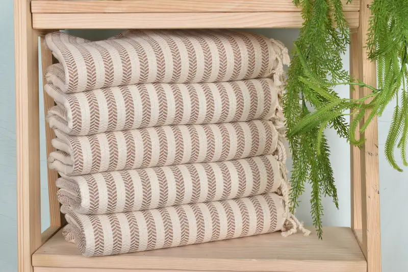 The Chevron Towel comprises organic cotton and linen fibers, ensuring high absorbency and durability. Characterized by a length of 40 inches and width of 71 inches, the towel weighs 440 grams, with a tolerance of up to 1-2.5 cm due to hand-weaving.