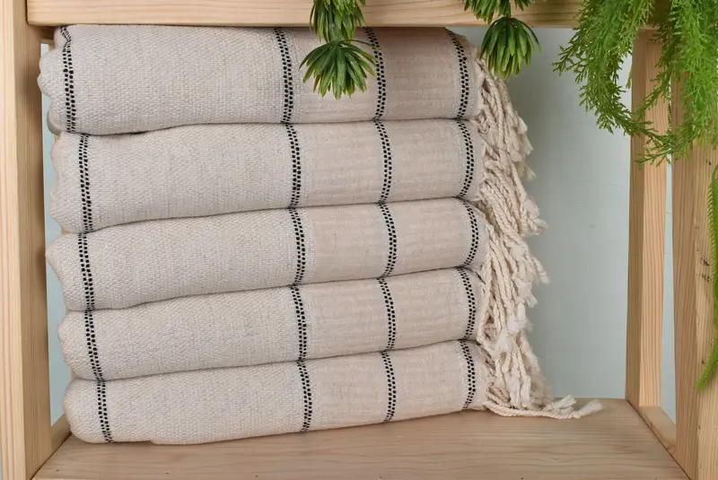 The beach towels are characterized by their material composition, being woven from a blend of organic cotton and linen, ensuring durability and comfort. Ensuring consistency, they measure 70x40 inches, with a weight of 340 grams. Hand-weaving results in slight variations of up to 2.5cm.