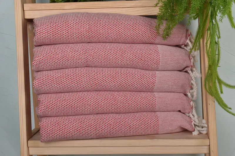 The product is a 24"x44" red cotton hand towel characterized by its organic and recycled cotton composition, ensuring superior absorbency and durability. Each towel weighs approximately 150 grams, with dimensions subjected to a slight variance due to the hand-weaving process, typically within a tolerance of 1-2.5cm.
