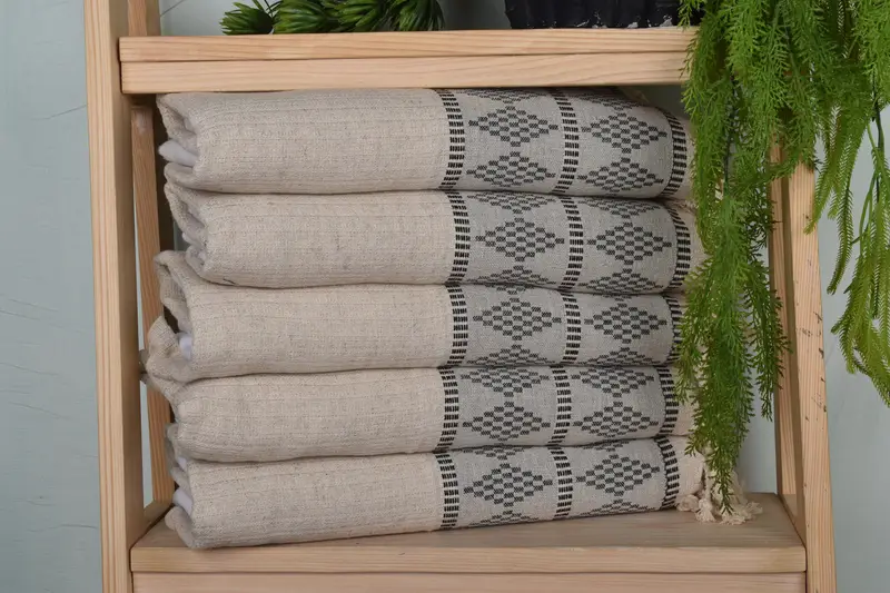 Organic cotton and linen fibers ensure the towels are highly absorbent, resulting in effective moisture wicking and durability. Characterized by a size of 40x20 inches and weighing approximately 120 grams, the hand-woven nature of these towels allows for minor variations of up to 1-2.5 cm.