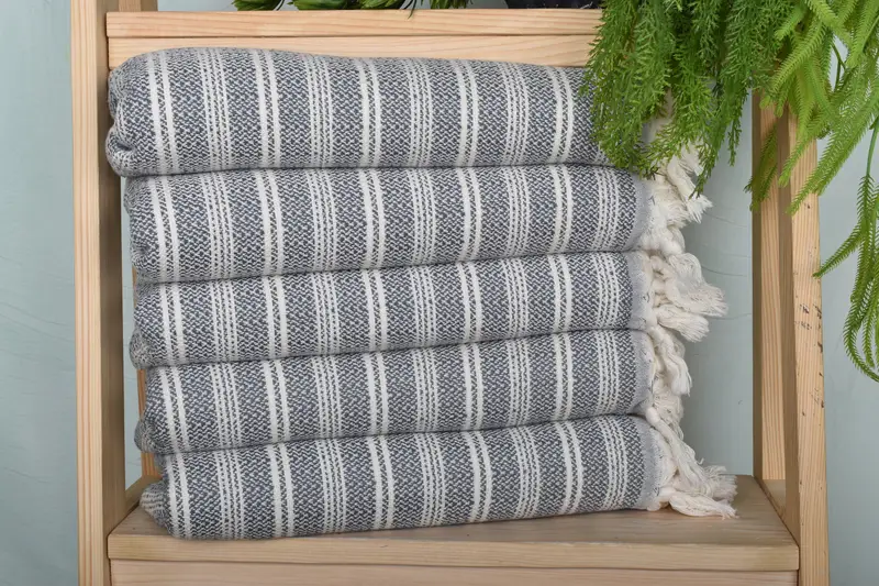The 18"x32" Dark Gray Cotton Tea Towel is characterized by its fiber composition of organic and recycled cotton, ensuring superior absorbency and a soft texture. Resulting in a product that is lightweight at 120 grams, these towels are handcrafted on a loom, allowing for slight variations in size and weight, typically within a 1-2.5 cm range. This hand-weaving process guarantees each towel's unique characteristics while maintaining consistent quality.
