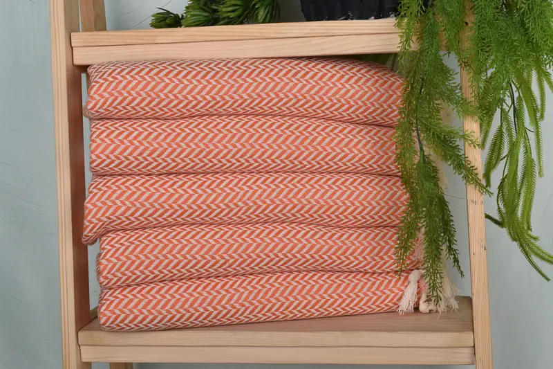 Characterized by its blend of organic and recycled cotton, the towel ensures a sustainable product choice. Measuring 36x18 inches, each piece weighs approximately 100 grams. The hand-weaving process introduces slight variances in size and weight.