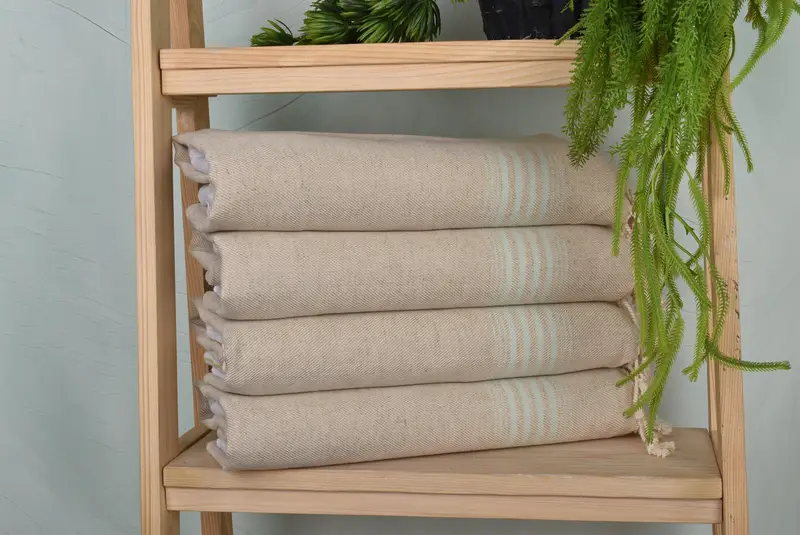 The product is woven from organic cotton and linen fibers, ensuring durability and high absorbency. Characterized by an 18"x36" (45.72 cm x 91.44 cm) size and a weight of 104 grams, the handmade nature of the towel results in size and weight variations of up to 1-2.5 cm.