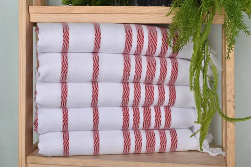 Organic cotton materials ensure high-quality absorbency, characterized by a smooth texture and durable construction. The hand-woven dish towel features dimensions of 36x24 inches, weighing 120 grams. Variations in size and weight are expected due to the manual weaving process, with tolerances of 1-2.5 centimeters.