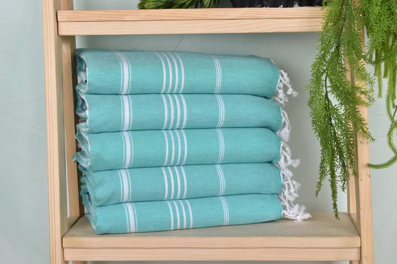 The towels are characterized by their organic cotton/linen composition, ensuring optimal absorbency and durability. Resulting in a lightweight yet robust towel, each piece weighs 280 grams and spans 40x71 inches. Handwoven on a loom, dimensions may vary slightly by up to 1-2.5 cm due to the handmade nature.