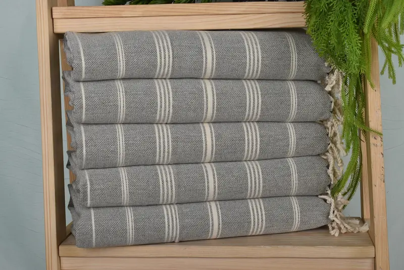 The product comprises organic cotton and linen, characterized by its superior absorbency and durability. Resulting in a handwoven towel with dimensions of 38x24 inches, this product weighs approximately 100 grams. Tolerances of 1-2.5 cm are expected due to the hand-weaving process.