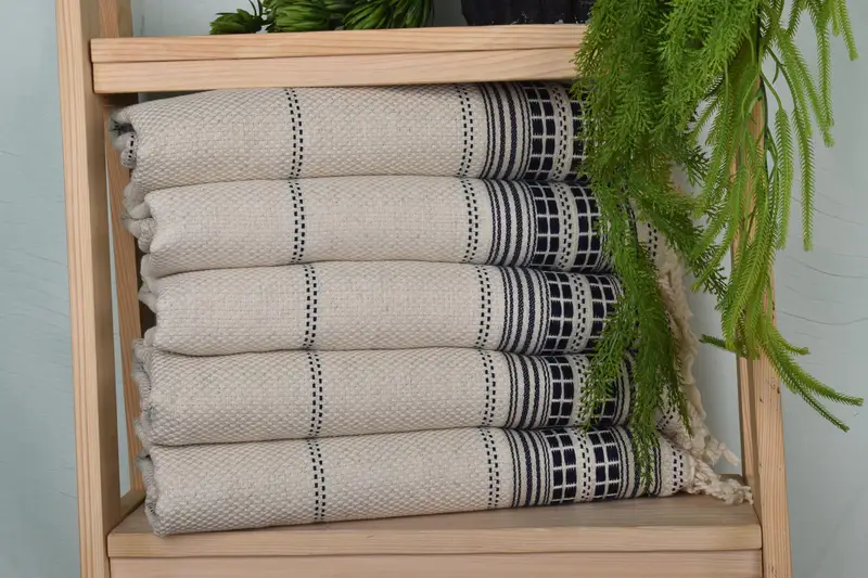 The product, characterized by its meticulous hand-weaving, consists of organic cotton and linen, ensuring durability and absorbency. Each hand towel measures precisely 40x20 inches, with a weight of 120 grams, and may exhibit slight variations of 1-2.5cm due to its handcrafted nature. Customization options include embroidery of names, initials, or logos with a choice of fonts and thread colors, and personalized orders may incur a shipping delay of up to two days.