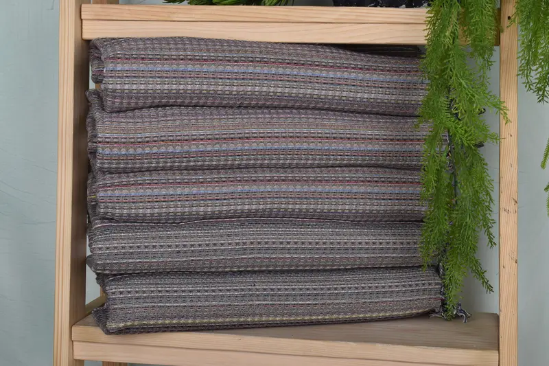 The towel is constructed using organic cotton and linen, ensuring durability and absorbency. Characterized by a length of 38 inches and width of 18 inches, the towel weighs 120 grams. Hand weaving introduces a tolerance of 1-2.5 cm in dimensions.
