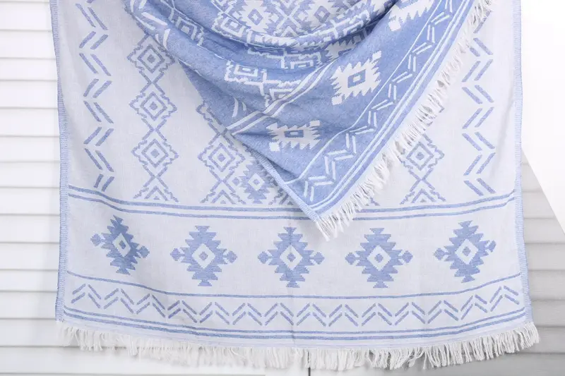 Organic Turkish cotton ensures superior absorbency, making it ideal for diverse applications. The towel dimensions measure 40x73 inches or 100x185 cm, with a weight of 340 grams. Hand-weaving tolerances for these dimensions are within 1-2.5cm.