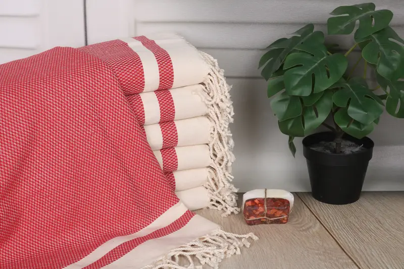 Characterized by high absorbency, the Red Striped Turkish Cotton Towel is made from organic Turkish cotton or natural linen, ensuring durability and sustainability. Measuring 70x40 inches (100x180 cm) and weighing 400 grams, the towel features slight hand-weaving tolerances of up to 1-2.5 cm, resulting in a unique, artisanal finish. Offering embroidery customization, the towel is pre-shrunk and ships globally via DHL Express, FedEx, and UPS, with a general delivery time of 2-5 days. Returns and exchanges are accepted within 7 days of delivery; ...